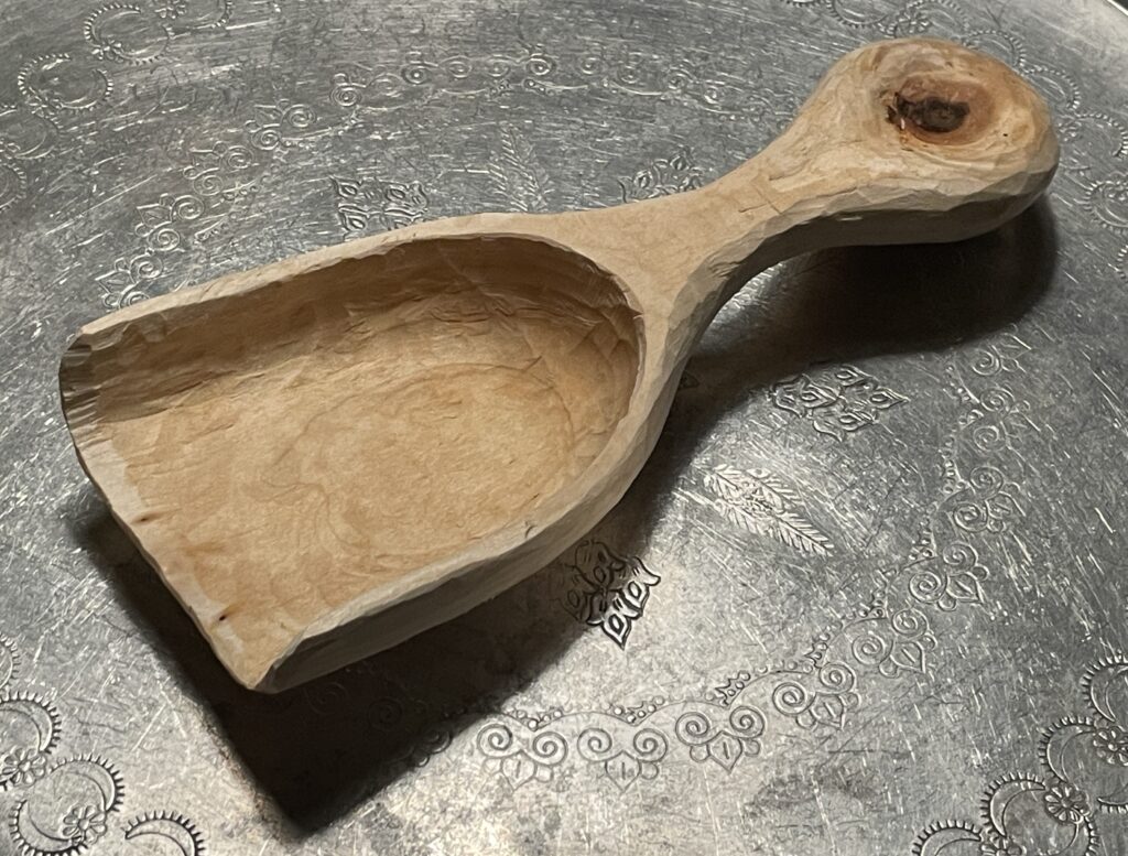 Lepels snijden is niet mijn specialiteit. De eerste leverde me een pleister op en een lepelvormig object dat ik niet op de foto zet. Maar op 8 februari heb ik mijn tweede gemaakt, gesteund door de ervaring en aanmoediging van de andere deelnemers. Wie weet…