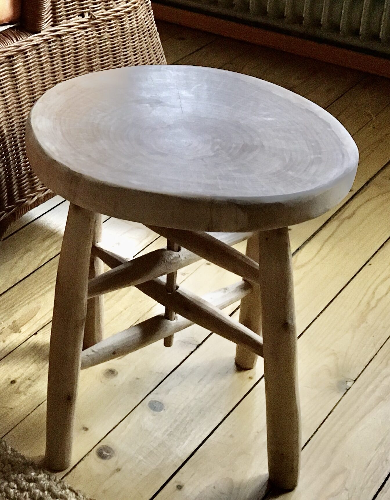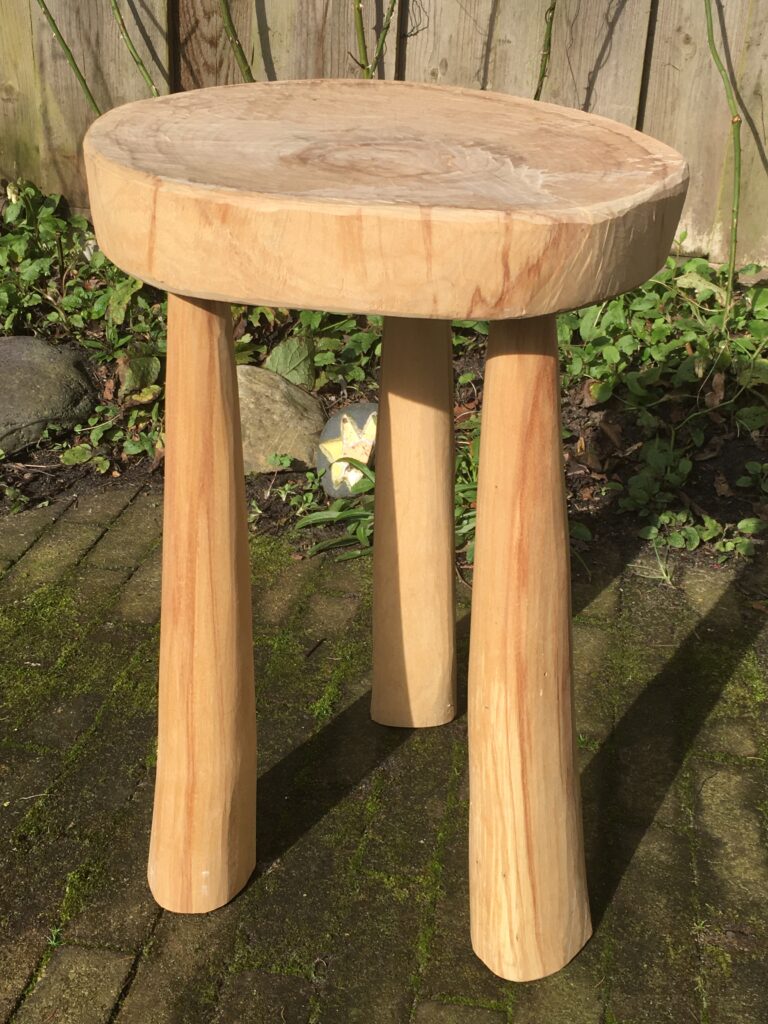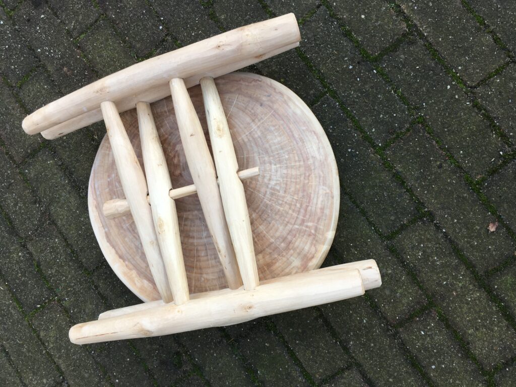 Lariks met metalen onderstel. Prijsindicatie € 170.- Berk. Prijsindicatie € 90.- Berk, uiteengenomen Berk 3-poot. Prijsindicatie € 100.- Driepoot berk. 52 cm hoog, 33 cm diameter.