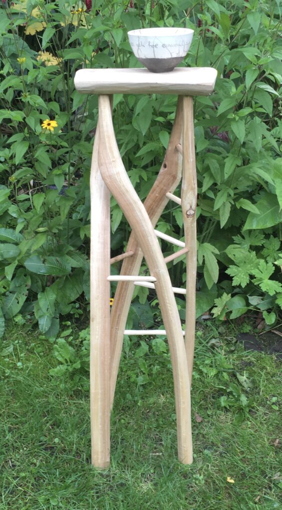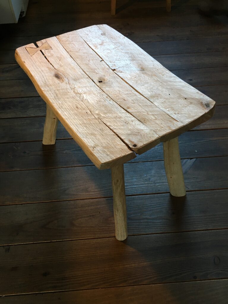 Pied de stalle, berk, Prijsindicatie € 140.- Beukenhout prijsindicatie 80,- Draaitafel, Amerikaanse vogelkers. Eik. Prijsindicatie € 160,- Eiken tafel, geheel handgemaakt, zonder lijm gemonteerd. 96 x 48 cm, 49 cm hoog. Bijzondere, organische vorm. Prijsindicatie 650,-
